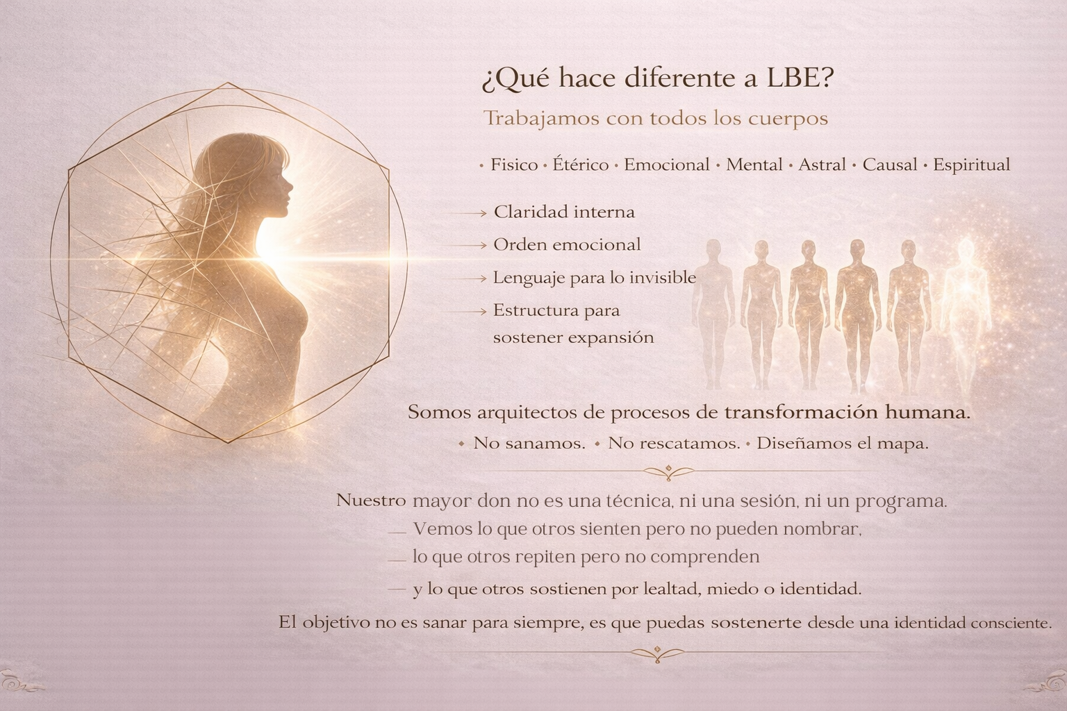 Trabajamos sobre la arquitectura interna que dirige tu forma de vivir, decidir y relacionarte , mediante un sistema de actualización profunda que te permite entenderte, sostenerte y expandirte desde un lugar más consciente..